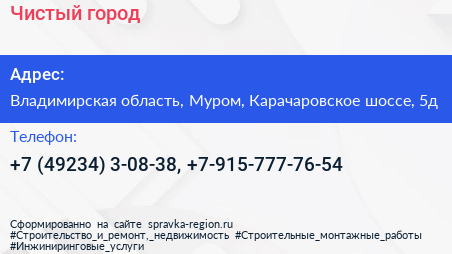 Чистый город по адресу Владимирская область, Муром, Карачаровское шоссе, 5д в дальнейшем Организация, размещена в следующих категориях: