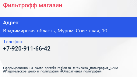Фильтрофф, магазин по адресу Владимирская область, Муром, Советская, 10 в дальнейшем Организация, размещена в следующих категориях: