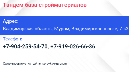 Тандем, база стройматериалов по адресу Владимирская область, Муром, Владимирское шоссе, 7 к3 в дальнейшем Организация, размещена в следующих категориях: