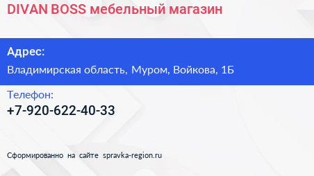 DIVAN BOSS, мебельный магазин по адресу Владимирская область, Муром, Войкова, 1Б в дальнейшем Организация, размещена в следующих категориях: