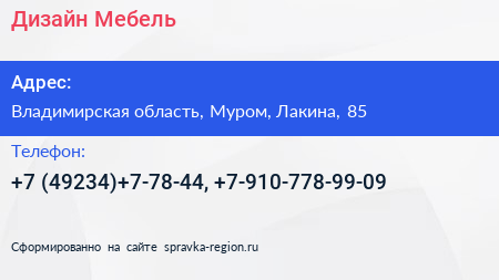 Дизайн Мебель по адресу Владимирская область, Муром, Лакина, 85 в дальнейшем Организация, размещена в следующих категориях: