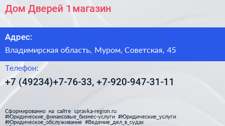 Дом Дверей №1, магазин по адресу Владимирская область, Муром, Советская, 45 в дальнейшем Организация, размещена в следующих категориях: