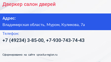 Дверкер, салон дверей по адресу Владимирская область, Муром, Куликова, 7а в дальнейшем Организация, размещена в следующих категориях: