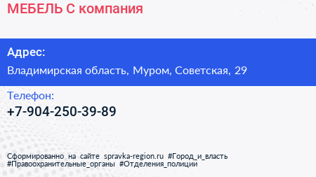 МЕБЕЛЬ-С, компания по адресу Владимирская область, Муром, Советская, 29 в дальнейшем Организация, размещена в следующих категориях: