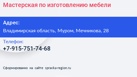 Мастерская по изготовлению мебели по адресу Владимирская область, Муром, Мечникова, 28 в дальнейшем Организация, размещена в следующих категориях:
