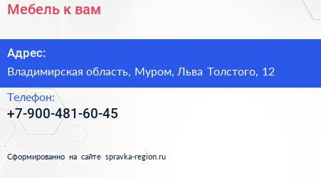 Мебель к вам по адресу Владимирская область, Муром, Льва Толстого, 12 в дальнейшем Организация, размещена в следующих категориях: