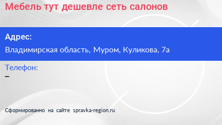 Мебель тут дешевле, сеть салонов по адресу Владимирская область, Муром, Куликова, 7а в дальнейшем Организация, размещена в следующих категориях: