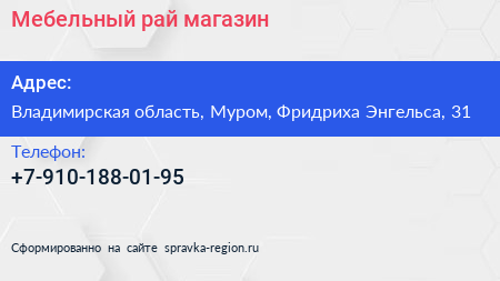 Мебельный рай, магазин по адресу Владимирская область, Муром, Фридриха Энгельса, 31 в дальнейшем Организация, размещена в следующих категориях: