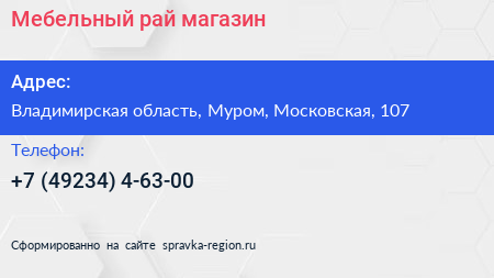 Мебельный рай, магазин по адресу Владимирская область, Муром, Московская, 107 в дальнейшем Организация, размещена в следующих категориях: