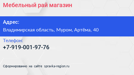 Мебельный рай, магазин по адресу Владимирская область, Муром, Артёма, 40 в дальнейшем Организация, размещена в следующих категориях: