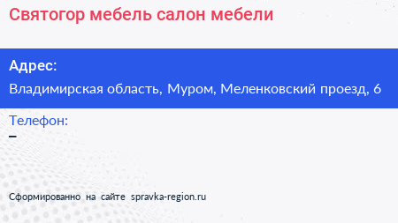 Святогор-мебель, салон мебели по адресу Владимирская область, Муром, Меленковский проезд, 6 в дальнейшем Организация, размещена в следующих категориях: