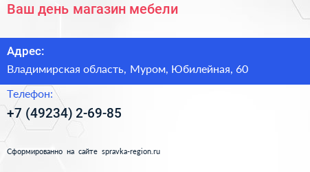 Ваш день, магазин мебели по адресу Владимирская область, Муром, Юбилейная, 60 в дальнейшем Организация, размещена в следующих категориях: