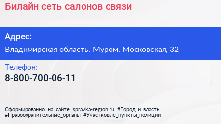 Билайн, сеть салонов связи по адресу Владимирская область, Муром, Московская, 32 в дальнейшем Организация, размещена в следующих категориях: