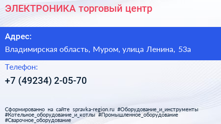 ЭЛЕКТРОНИКА, торговый центр по адресу Владимирская область, Муром, улица Ленина, 53а в дальнейшем Организация, размещена в следующих категориях: