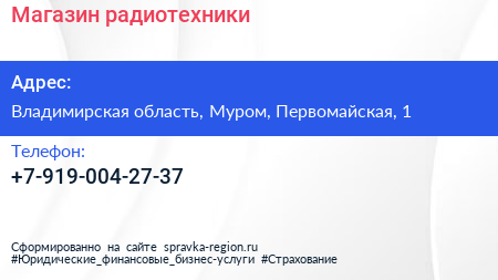 Магазин радиотехники по адресу Владимирская область, Муром, Первомайская, 1 в дальнейшем Организация, размещена в следующих категориях: