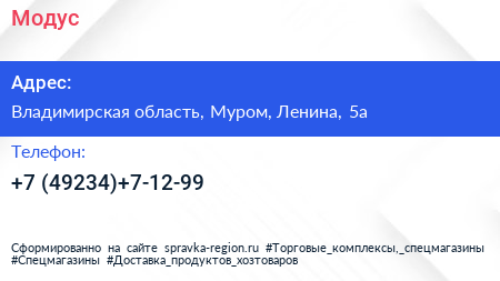 Модус по адресу Владимирская область, Муром, Ленина, 5а в дальнейшем Организация, размещена в следующих категориях: