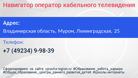 Навигатор, оператор кабельного телевидения по адресу Владимирская область, Муром, Ленинградская, 25 в дальнейшем Организация, размещена в следующих категориях: