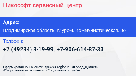 Никософт, сервисный центр по адресу Владимирская область, Муром, Коммунистическая, 36 в дальнейшем Организация, размещена в следующих категориях: