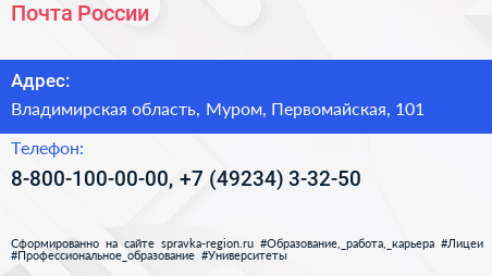 Почта России по адресу Владимирская область, Муром, Первомайская, 101 в дальнейшем Организация, размещена в следующих категориях: