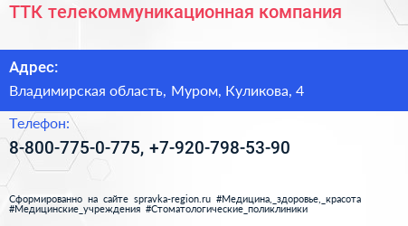 ТТК, телекоммуникационная компания по адресу Владимирская область, Муром, Куликова, 4 в дальнейшем Организация, размещена в следующих категориях: