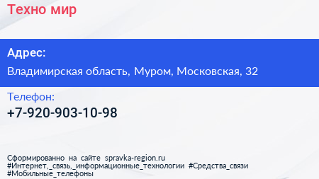 Техно-мир по адресу Владимирская область, Муром, Московская, 32 в дальнейшем Организация, размещена в следующих категориях: