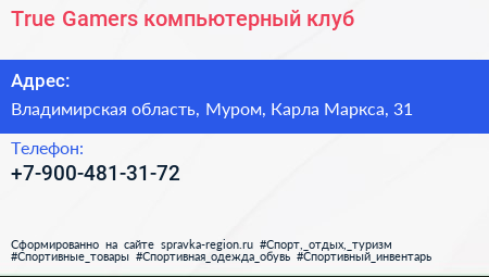 True Gamers, компьютерный клуб по адресу Владимирская область, Муром, Карла Маркса, 31 в дальнейшем Организация, размещена в следующих категориях: