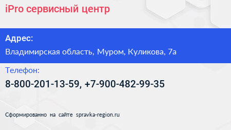 iPro, сервисный центр по адресу Владимирская область, Муром, Куликова, 7а в дальнейшем Организация, размещена в следующих категориях: