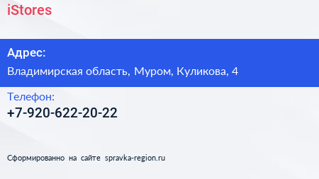 iStores по адресу Владимирская область, Муром, Куликова, 4 в дальнейшем Организация, размещена в следующих категориях: