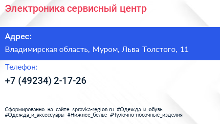 Электроника, сервисный центр по адресу Владимирская область, Муром, Льва Толстого, 11 в дальнейшем Организация, размещена в следующих категориях: