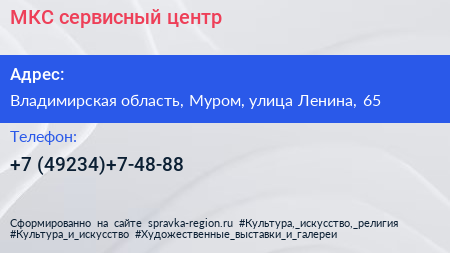 МКС, сервисный центр по адресу Владимирская область, Муром, улица Ленина, 65 в дальнейшем Организация, размещена в следующих категориях:
