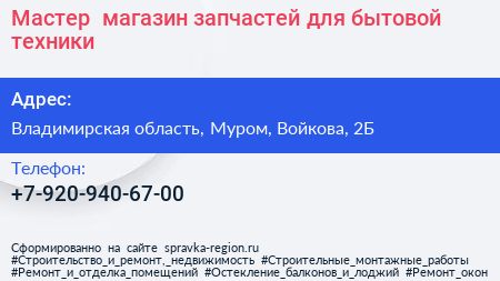 Мастер+, магазин запчастей для бытовой техники по адресу Владимирская область, Муром, Войкова, 2Б в дальнейшем Организация, размещена в следующих категориях: