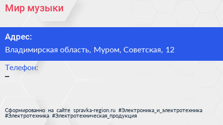 Мир музыки по адресу Владимирская область, Муром, Советская, 12 в дальнейшем Организация, размещена в следующих категориях: