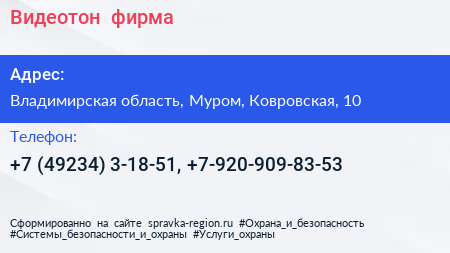 Видеотон+, фирма по адресу Владимирская область, Муром, Ковровская, 10 в дальнейшем Организация, размещена в следующих категориях: