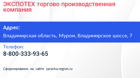 ЭКСПОТЕХ, торгово-производственная компания по адресу Владимирская область, Муром, Владимирское шоссе, 7 в дальнейшем Организация, размещена в следующих категориях: