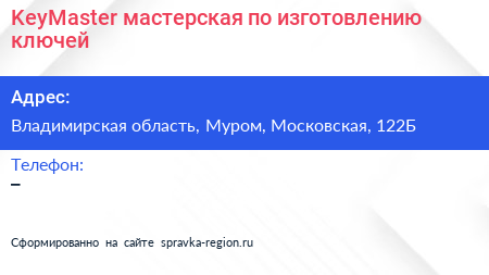 KeyMaster, мастерская по изготовлению ключей по адресу Владимирская область, Муром, Московская, 122Б в дальнейшем Организация, размещена в следующих категориях: