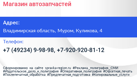 Магазин автозапчастей по адресу Владимирская область, Муром, Куликова, 4 в дальнейшем Организация, размещена в следующих категориях: