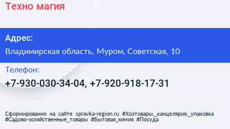 Техно-магия по адресу Владимирская область, Муром, Советская, 10 в дальнейшем Организация, размещена в следующих категориях: