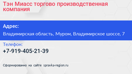 Тэн-Миасс, торгово-производственная компания по адресу Владимирская область, Муром, Владимирское шоссе, 7 в дальнейшем Организация, размещена в следующих категориях: