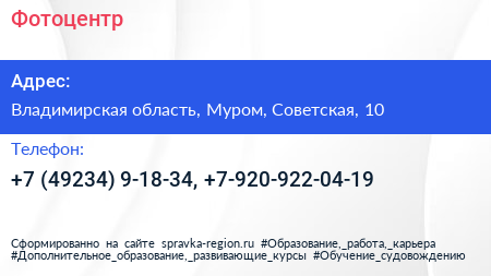 Фотоцентр по адресу Владимирская область, Муром, Советская, 10 в дальнейшем Организация, размещена в следующих категориях: