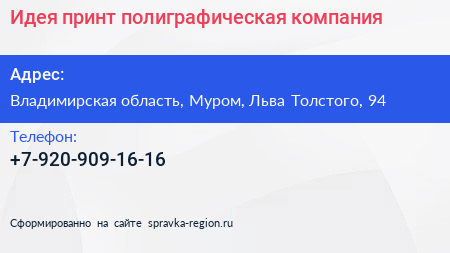 Идея-принт, полиграфическая компания по адресу Владимирская область, Муром, Льва Толстого, 94 в дальнейшем Организация, размещена в следующих категориях: