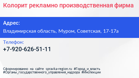 Колорит, рекламно-производственная фирма по адресу Владимирская область, Муром, Советская, 17-17а в дальнейшем Организация, размещена в следующих категориях: