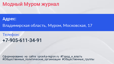 Модный Муром, журнал по адресу Владимирская область, Муром, Московская, 17 в дальнейшем Организация, размещена в следующих категориях: