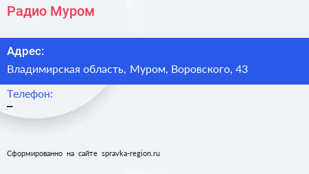 Радио Муром по адресу Владимирская область, Муром, Воровского, 43 в дальнейшем Организация, размещена в следующих категориях: