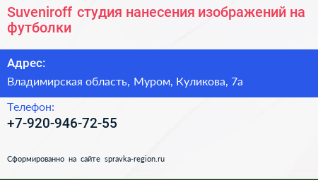 Suveniroff, студия нанесения изображений на футболки по адресу Владимирская область, Муром, Куликова, 7а в дальнейшем Организация, размещена в следующих категориях: