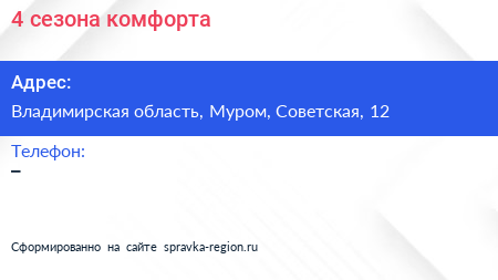 4 сезона комфорта по адресу Владимирская область, Муром, Советская, 12 в дальнейшем Организация, размещена в следующих категориях:
