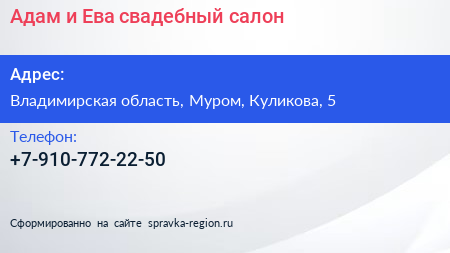 Адам и Ева, свадебный салон по адресу Владимирская область, Муром, Куликова, 5 в дальнейшем Организация, размещена в следующих категориях: