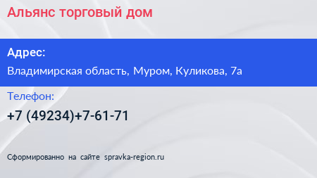 Альянс, торговый дом по адресу Владимирская область, Муром, Куликова, 7а в дальнейшем Организация, размещена в следующих категориях: