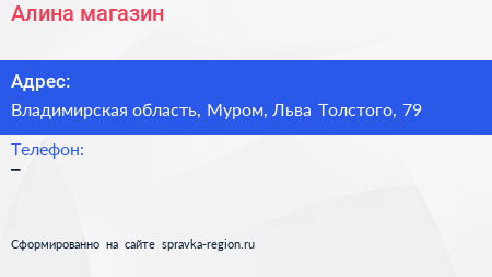 Алина, магазин по адресу Владимирская область, Муром, Льва Толстого, 79 в дальнейшем Организация, размещена в следующих категориях: