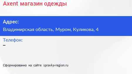 Axent, магазин одежды по адресу Владимирская область, Муром, Куликова, 4 в дальнейшем Организация, размещена в следующих категориях: