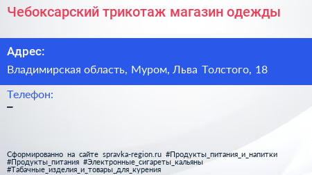 Чебоксарский трикотаж, магазин одежды по адресу Владимирская область, Муром, Льва Толстого, 18 в дальнейшем Организация, размещена в следующих категориях: